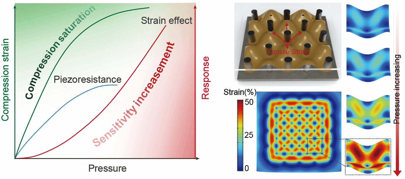 相关成果以“Breaking the Saturation of Sensitivity for Ultrawide Range Flexible Pressure Sensors by Soft-Strain Effect”为题发表在Advanced Materials期刊。柔性电子研究院博士生李玥、西安市红会医院张维杰博士为本文的共同第一作者,黄维院士、王学文教授为共同通讯作者。