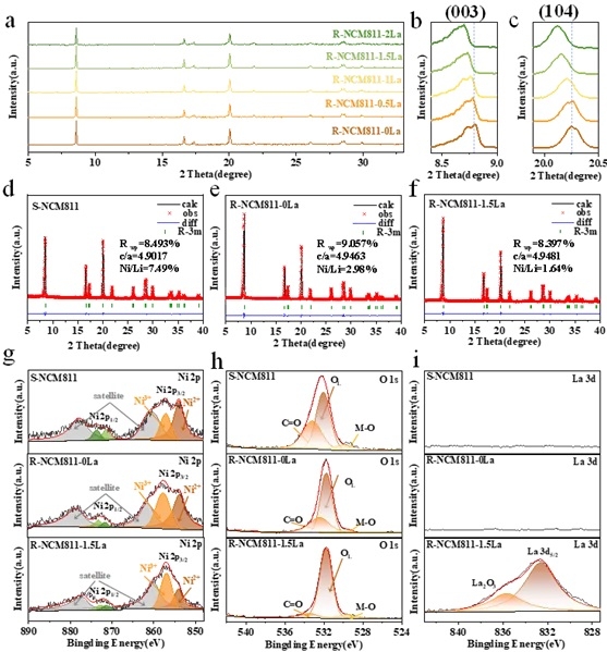 图3.(a) R-NCM811-0La、R-NCM811-0.5La、R-NCM811-1La、R-NCM811-1.5La和R-NCM811-2La样品的XRD谱图;(b, c) R-NCM811-0La、R-NCM811-0.5La、R-NCM811-1La、R-NCM811-1.5La和R-NCM811-2La样品的(003)和(104)衍射峰放大图;(d, e, f) S-NCM811、R-NCM811-0La和R-NCM811-1.5La样品XRD数据的Rietveld细化;(g) S-NCM811、R-NCM811-0La和R-NCM811-1.5La样品的Ni 2p XPS图谱比较;(h) S-NCM811、R-NCM811-0La和R-NCM811-1.5La样品O 1s XPS图谱比较;(i) S-NCM811、R-NCM811-0La和R-NCM811-1.5La样品的La 3d XPS图谱比较。