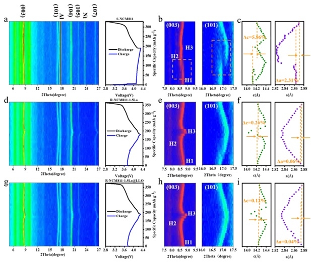 图5.循环过程中阴极演化的动态相位跟踪。(a)S-NCM811、(d)R-NCM811-1.5La和(g)R-NCM811-1.5La@LLO样品在第1个循环中的原位XRD图谱和相应的恒流充放电曲线。(b)S-NCM811、(e)R-NCM811-1.5La和(h)R-NCM811-1.5La@LLO样品在7.5°-9.5°和16°-17.5°范围内的放大衍射图。(b)S-NCM811、(d)R-NCM811-1.5La和(f)R-NCM811-1.5La@LLO样品在第1次循环期间c和a的晶格参数变化。