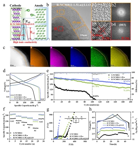 图4. (a)S-NCM811的界面阻抗结构和带有LLO离子导电涂层的R-NCM811-1.5La的阳离子迁移;(b)R-NCM811-1.5La@LLO样品颗粒边缘的HR-TEM图像。插图是图4b中I和Ⅱ区域的HR-TEM和FFT图像,用橙色(b1和b2)和红色矩形(b3和b4)标记。(c)R-NCM811-1.5La@LLO的HAADF-TEM图像与Ni、Co、Mn、O和La的EDS图像;(d)S-NCM811、R-NCM811-1.5La和R-NCM811-1.5La@LLO样品的初始充放电曲线;(e)S-NCM811、R-NCM811-1.5La和R-NCM811-1.5La@LLO在1C时2.8-4.3 V电压范围内的循环性能;(f)S-NCM811、R-NCM811-1.5La和R-NCM811-1.5La@LLO的倍率性能(g)S-NCM811、R-NCM811-1.5La和R-NCM811-1.5La@LLO的EIS曲线和等效电路;(h)S-NCM811、R-NCM811-1.5La和R-NCM811-1.5La@LLO的GITT曲线和Li+的化学扩散系。