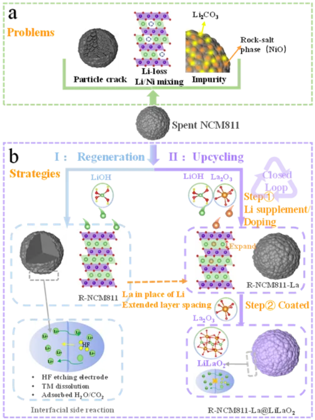 图1.(a)废旧富镍层状阴极的固有缺陷;(b)常规煅烧再生和升级再生策略过程中的结构/界面演化。