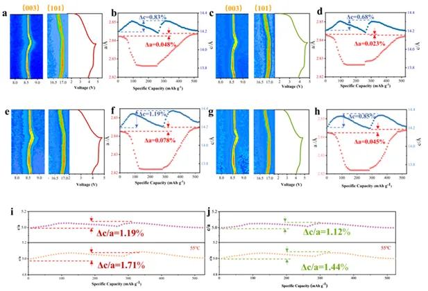 图2.循环时的动态相位跟踪。(a)在25 ℃下,LLOPF-0样品在第一个循环期间的XRD谱图和(b)晶格参数变化。(c)25℃下LLOPF-1第1循环时的原位XRD图谱等高线图和(d)晶格参数变化。(e)LLOPF-0样品在55℃下第一次循环时的原位XRD图谱和(f)晶格参数变化。(g) 55℃时LLOPF-1的原位XRD图谱等高线图和h)晶格参数变化。(i)LLOPF-0和(j)LLOPF-1在25和55℃时的c/a变化。