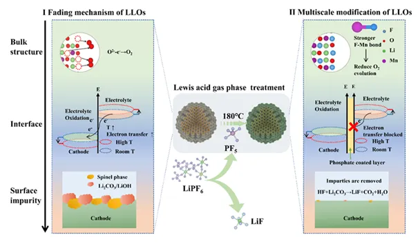 图1.通过路易斯酸性气体处理LLO正极的多尺度改性的示意图。(I)LLO正极跨尺度的衰落机理,包括晶格氧释放、界面副反应以及由于表面碱/碳酸盐杂质引起的离子传输受阻(II)LLO正极的多尺度修饰,包括体相晶格掺杂、抑制O2释放以及界面杂质去除。