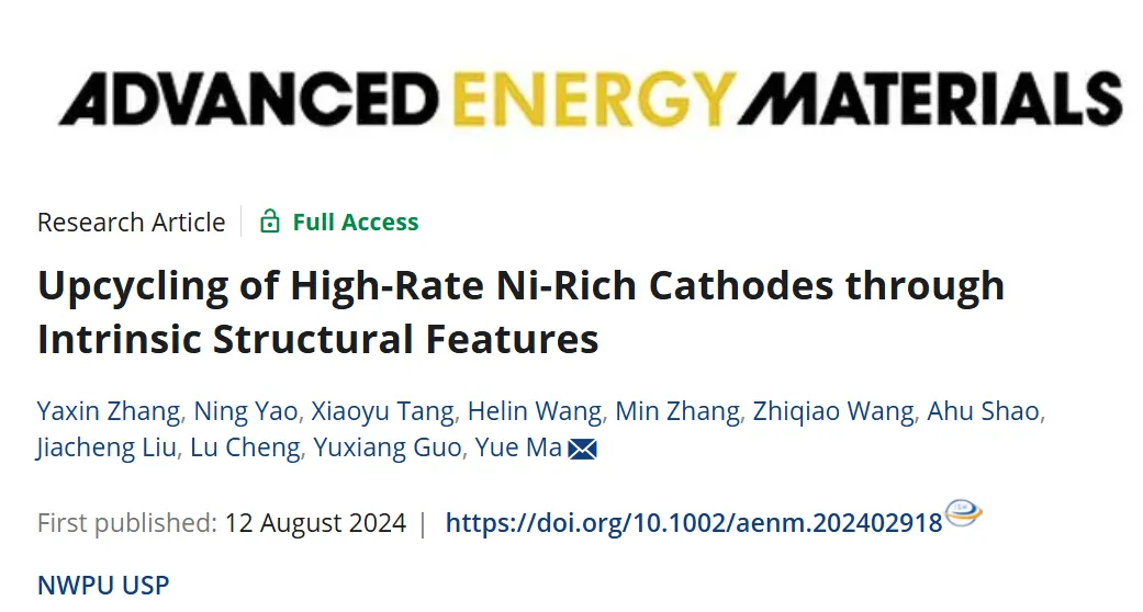 基于上述研究背景,该工作提出了一种简单、双功能的废旧富镍阴极升级再生的方法以提高其倍率性能。具体而言,该策略合理地利用降解氧化物中的Li空位,使La扩散势垒最小化,扩大了层状结构的晶格间距;此外阳离子导电包覆涂层LiLaO2进一步抑制了界面酸腐蚀和结构向岩盐相退化。透射模式X射线衍射跟踪了再生阴极在充放电过程中的可逆晶格呼吸,表明这是一个连续的、动力学促进的固溶转变过程,所有的微裂纹都得到了修复。因此,组装好的再生阴极R-NCM811-1.5La@LLO/Gr软包电池(1.4 Ah)在500次循环中达到91.0%的容量保持率,能量密度为277 Wh kg-1以及电池级的输出功率1030Wh kg-1。该文章以“Upcycling of High-Rate Ni-Rich Cathodes through Intrinsic Structural Features” 为题发表在国际知名期刊Advanced Energy Materials (IF=24.4)上。本文第一作者为材料学院纳米能源材料研究中心硕士研究生张雅鑫,通讯作者为马越教授,第一通讯单位为西北工业大学。