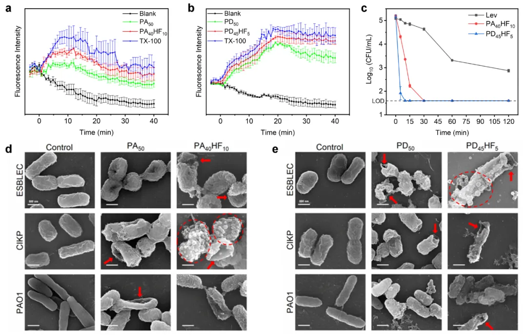 图3:PAmHFn和PDmHFn的抗菌机理。a-b: PAmHFn和PDmHFn的膜去极化作用;c: PA40HF10、PD45HF5和左氧氟沙星对ESBL-EC的细菌杀伤动力学;d-e:细菌与不同聚合物共孵育后的形貌变化。