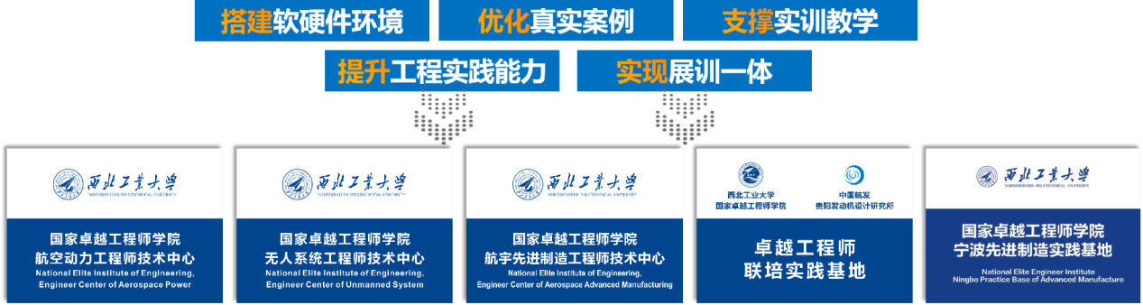 以国家级/省部级重点实验室为依托,已挂牌建设无人系统、航空动力、航宇智能制造3个类企业级工程技术中心,联合企业开设12门,共计240课时的工程师特色实践课程。与中国航发贵阳所、宁波研究院、中航西飞、兵器爱生集团建设卓越工程师实践基地。