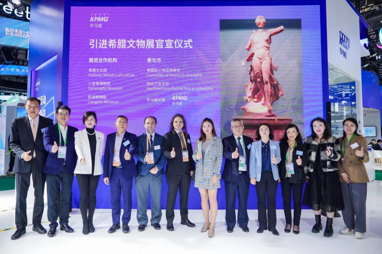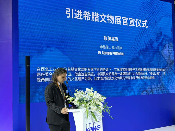 11月8日上午,“2024年进博会希腊文物展官宣仪式”在上海进博会现场举行,三星堆博物馆、良渚博物院联合希腊文化部正式宣布将引进“古希腊的旅程”(暂定名)精品文物展,该展览将于2025年4月到2026年3月之间分别在三星堆博物馆、良渚博物院各展出半年,展品主要包括精美绝伦的青铜器、金器、雕塑等文化瑰宝共计160余件(套)。希腊驻上海总领事馆总领事Georgios Partheniou 先生、外交领事Dimitrios Foukis先生亲临现场见证官宣,三星堆博物馆景区管委会主任范晓华、良渚博物院执行院长马东峰等嘉宾出席并致辞。西北工业大学作为本次展览的学术策划受邀出席活动,艺术教育中心首席专家刘惠教授,文化遗产研究院院长程圩以及太仓研究院相关专家学者受邀参会。