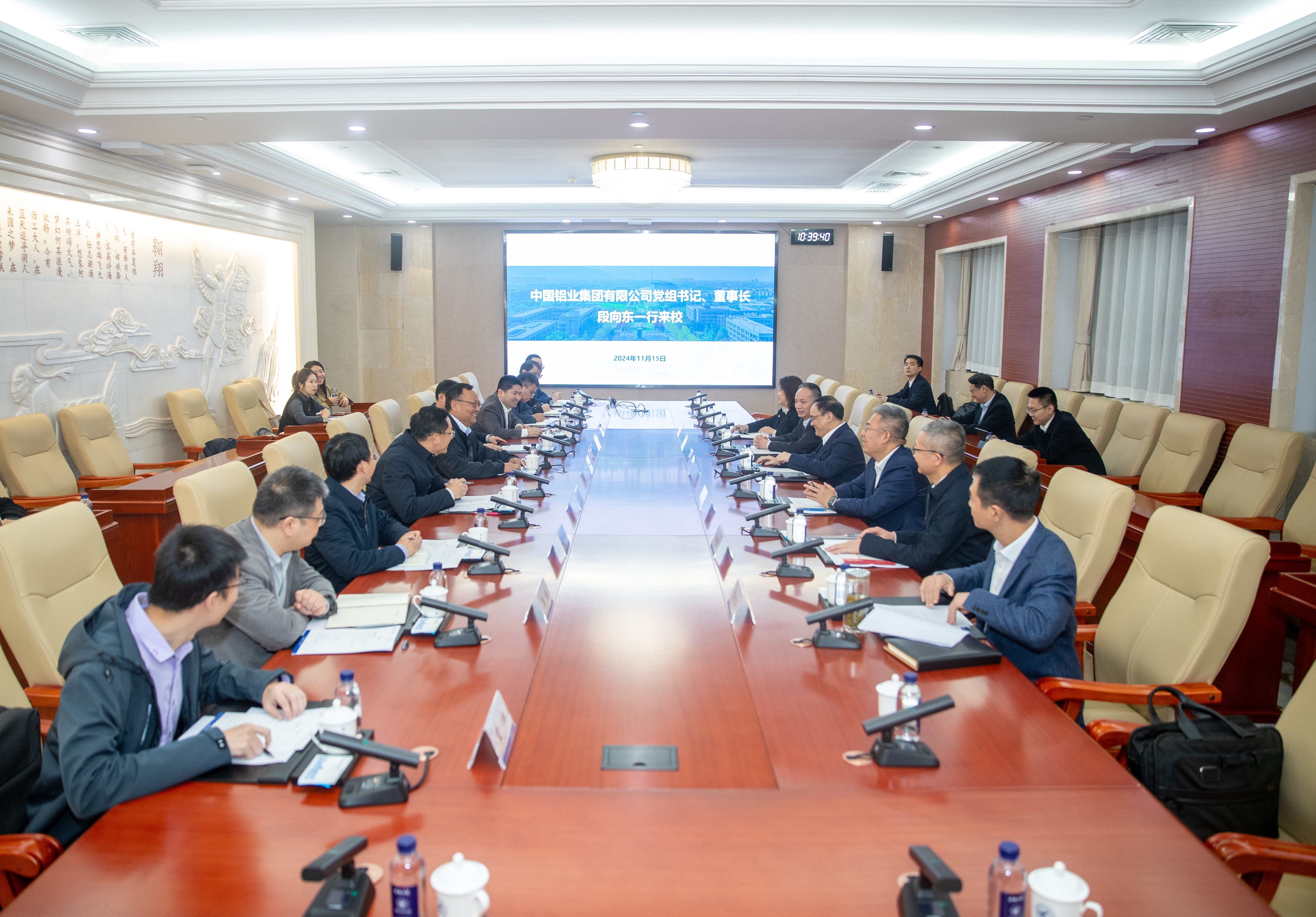 11月15日,中国铝业集团有限公司党组书记、董事长段向东一行来校调研。校长宋保维与段向东一行进行座谈,副校长詹浩参加活动。