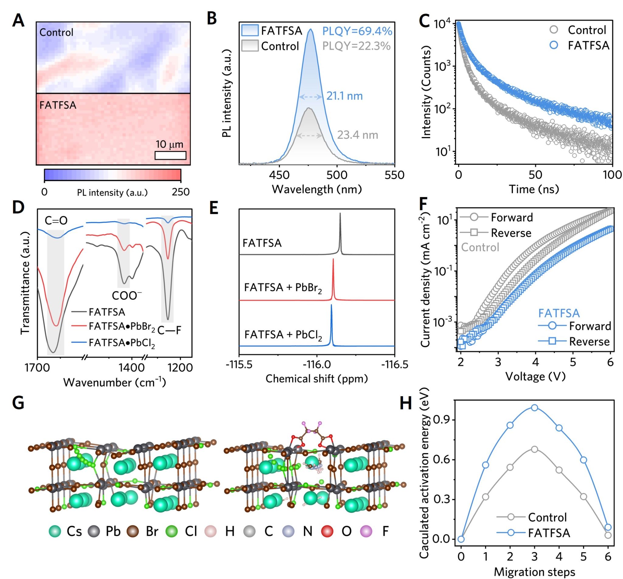 钙钛矿型发光二极管在显示屏和照明技术等领域展现了极大的应用前景。然而,蓝光设备的效率以及光谱的稳定性仍是亟待克服的关键难题。对于准二维钙钛矿,普遍存在低维相形成的不可控现象,这导致了能级分布的不均匀,进而引起载流子的非辐射复合,影响其发光效率。同时,混合卤素钙钛矿中引入的氯离子易产生缺陷和离子迁移,导致相分离,使得薄膜能量分布混乱,不利于提升器件效率和光谱稳定性。通过向钙钛矿前驱体溶液中加入多功能添加剂四氟丁二酸甲脒,显著提高了钙钛矿薄膜的发光均匀性和亮度,并且荧光寿命得以延长,这表明缺陷被有效钝化,非辐射复合现象减少。理论计算指出,氯离子的迁移被显著抑制,有利于增强光谱和运行稳定性。添加四氟丁二酸甲脒后,钙钛矿薄膜中的低维相显著减少,促进了能量的快速传递和载流子的辐射复合。进一步地,在钙钛矿与空穴传输层界面采用双亲性分子进行修饰,不仅降低了界面能量损失,还抑制了低维相的形成,从而提高了能量分布的均一性。采用这种策略,成功制备出了具有稳定光谱的蓝光发射(478 nm)和峰值外部量子效率为21.9%的钙钛矿发光二极管,这一成果代表了同类器件的顶尖水平,为开发高性能蓝光钙钛矿发光二极管提供了一种有效的解决途径。