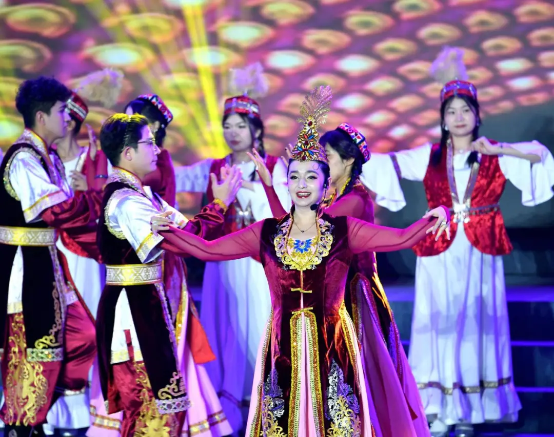 少数民族学生代表们带来舞蹈《多彩中华》,他们身着绚丽多彩的民族服饰,诠释团结繁荣的中华民族。