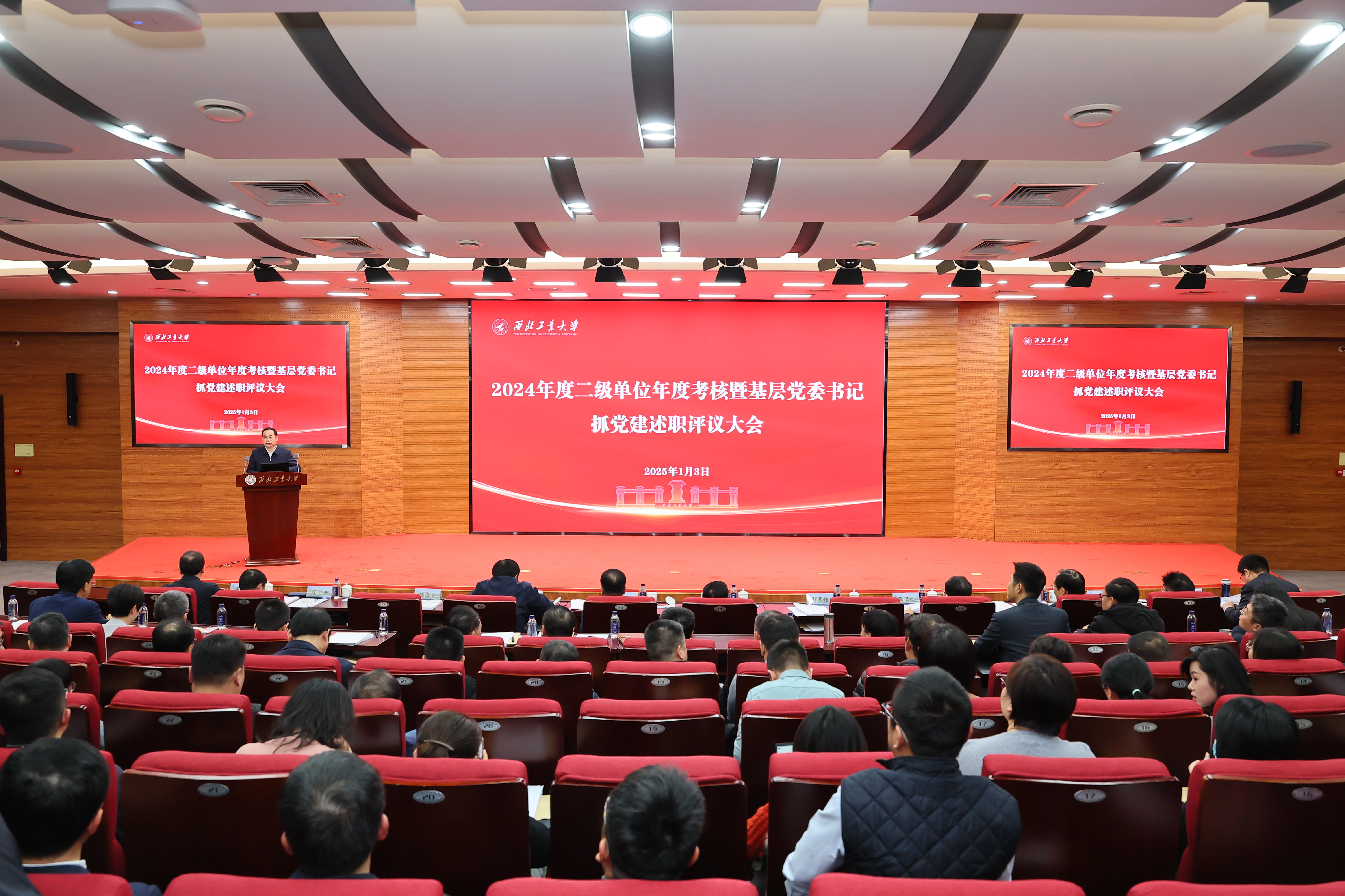 1月2-3日,学校召开2024年度二级单位考核暨基层党委书记抓党建述职评议大会。党委书记李言荣,校长宋保维出席大会并分别作了讲话。全体校领导,校学术委员会主任黄维院士,学校党委委员、纪委委员,中层正职以及教师、学生代表等200余人参加大会。基层党委书记抓党建述职评议大会由党委常务副书记程基伟主持,二级单位述职考核大会由副校长侯成义主持。