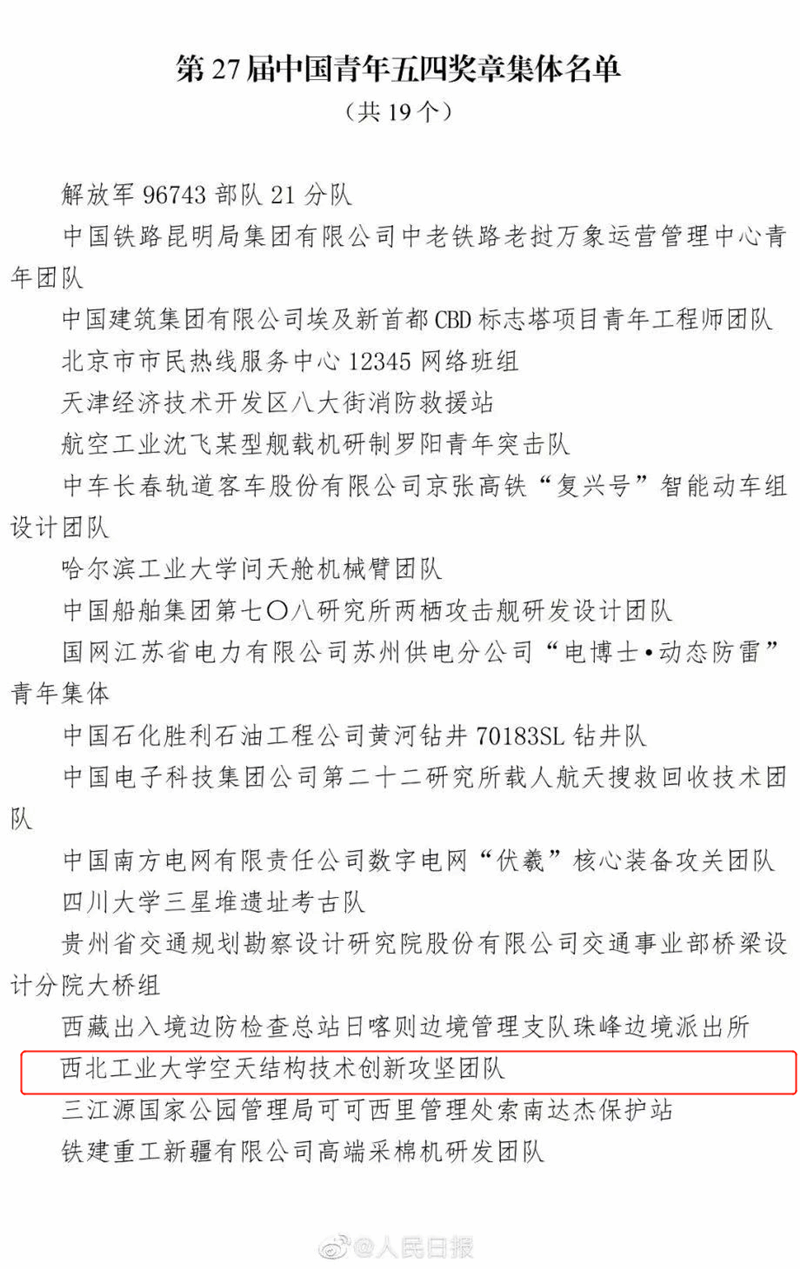 西北工业大学空天结构技术创新攻坚团队成功入选获奖集体,这也是学校首次荣获中国青年五四奖章集体奖。