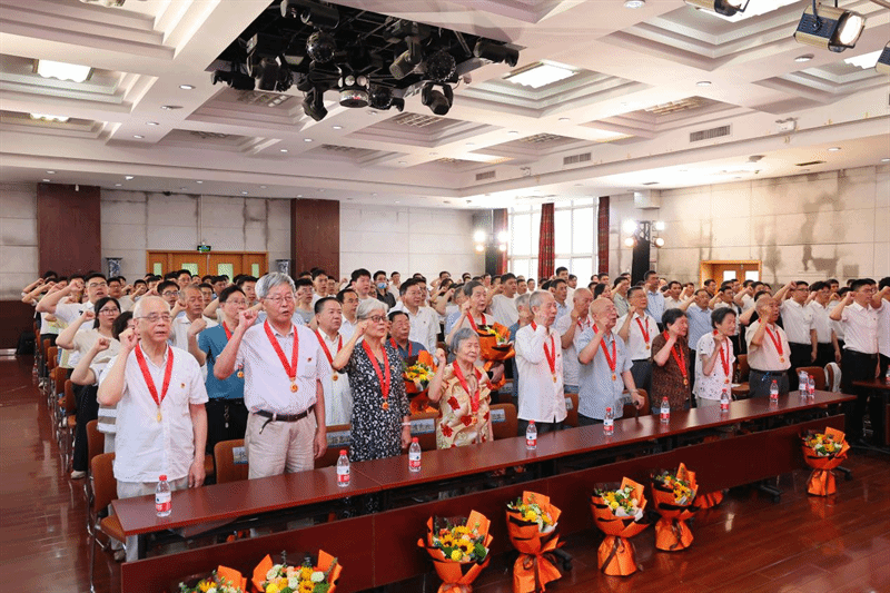 李言荣、程基伟、老党员代表、新发展教职工党员和学生党员代表、基层党委(党总支)负责同志参加纪念章颁发暨宣誓仪式。仪式由陈建有主持。
