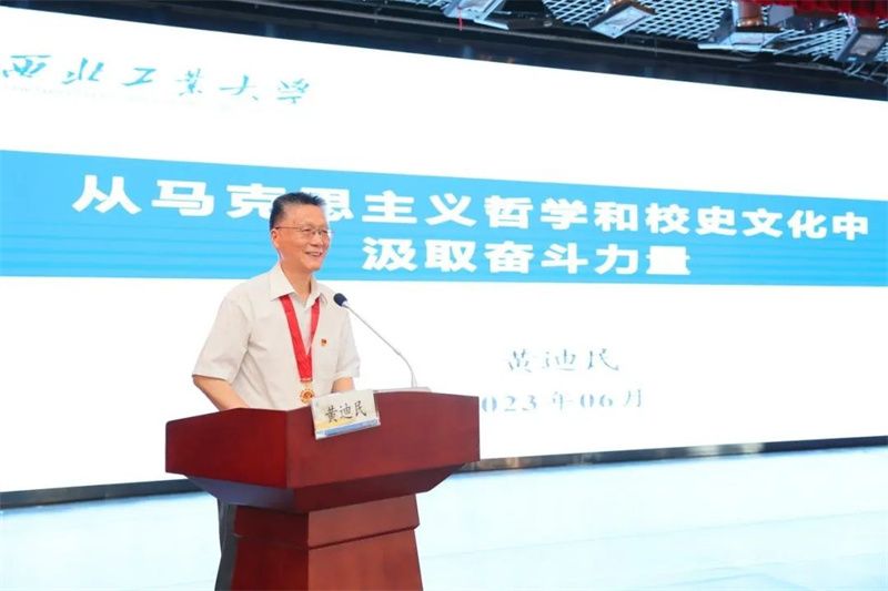 6月30日下午,离退休老党员黄迪民同志给新党员同志讲述题为《从马克思主义哲学和校史文化中汲取奋斗力量》的党课。