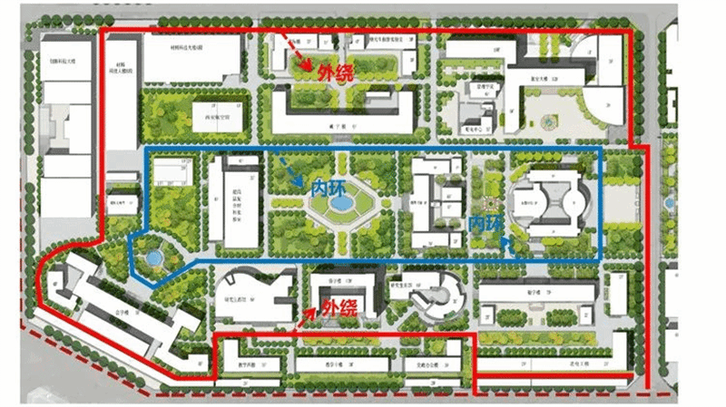 学校重新规划校园交通,提高路网服务能力,形成了围绕教学科研区周线“绕环”,并配套建成出入口控制机、道闸、诱导屏等智慧停车管理系统,彻底解决教学科研区人车混行、停车难等问题。