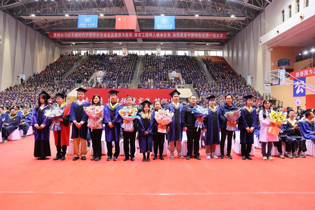 典礼开始前,校领导,院士代表,校友代表,校学位评定委员会委员与全体优秀毕业生合影留念。