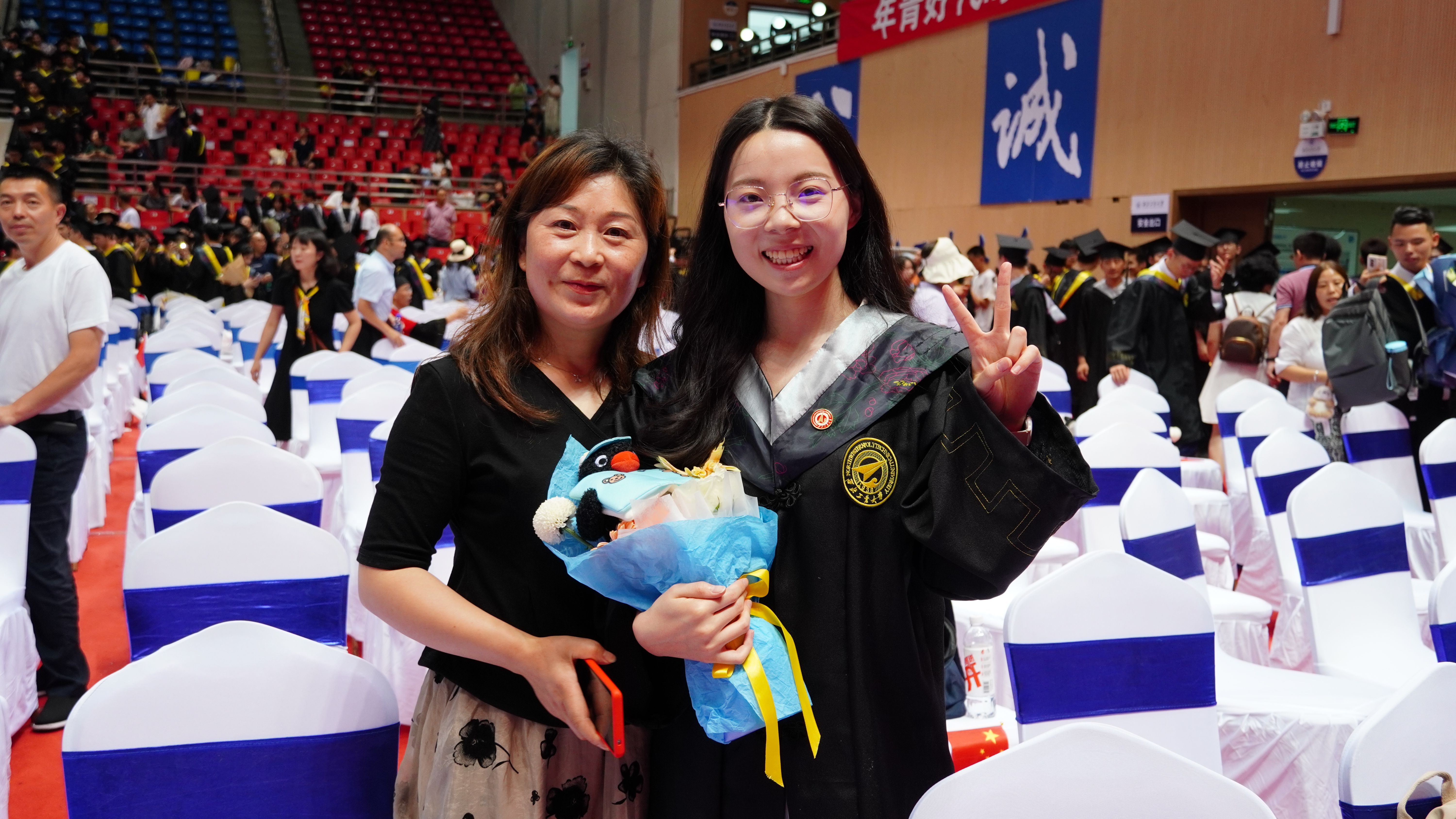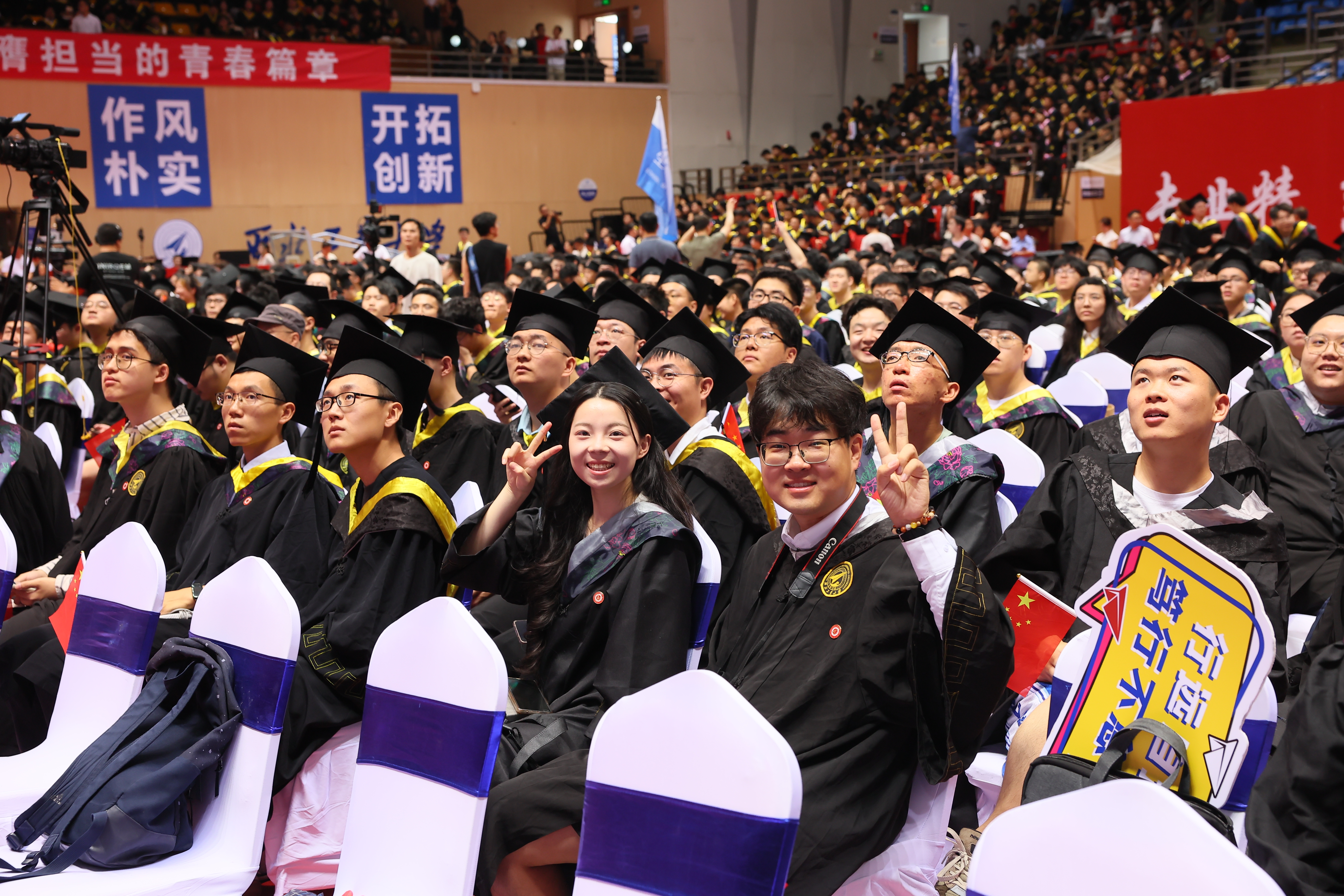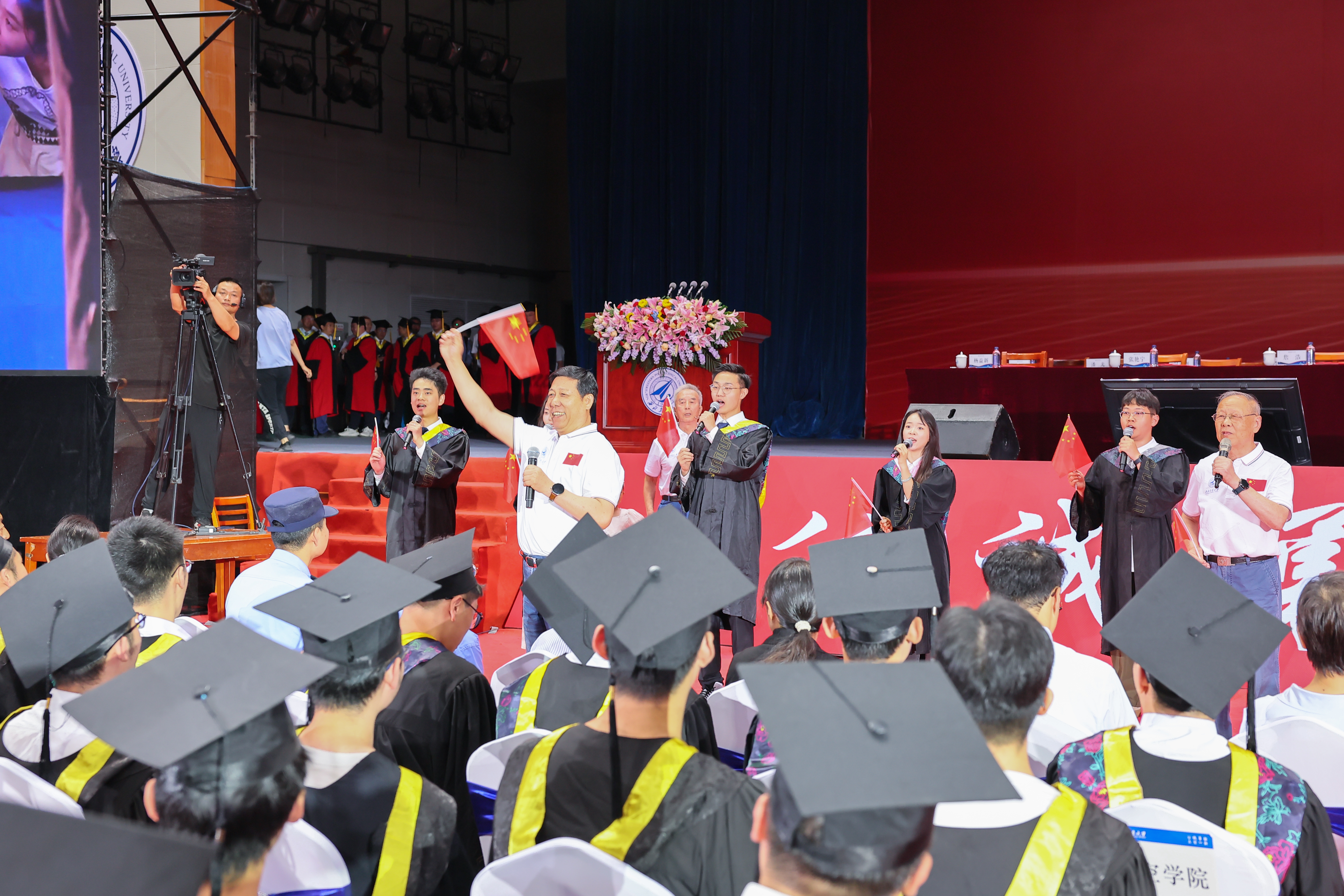随后,校长宋保维宣读学位授予决定,各学院毕业生们依次摇起院旗,高喊口号。嘹亮的口号声在场馆内回响,同学们尽情抒发强国有我新征程的意志!