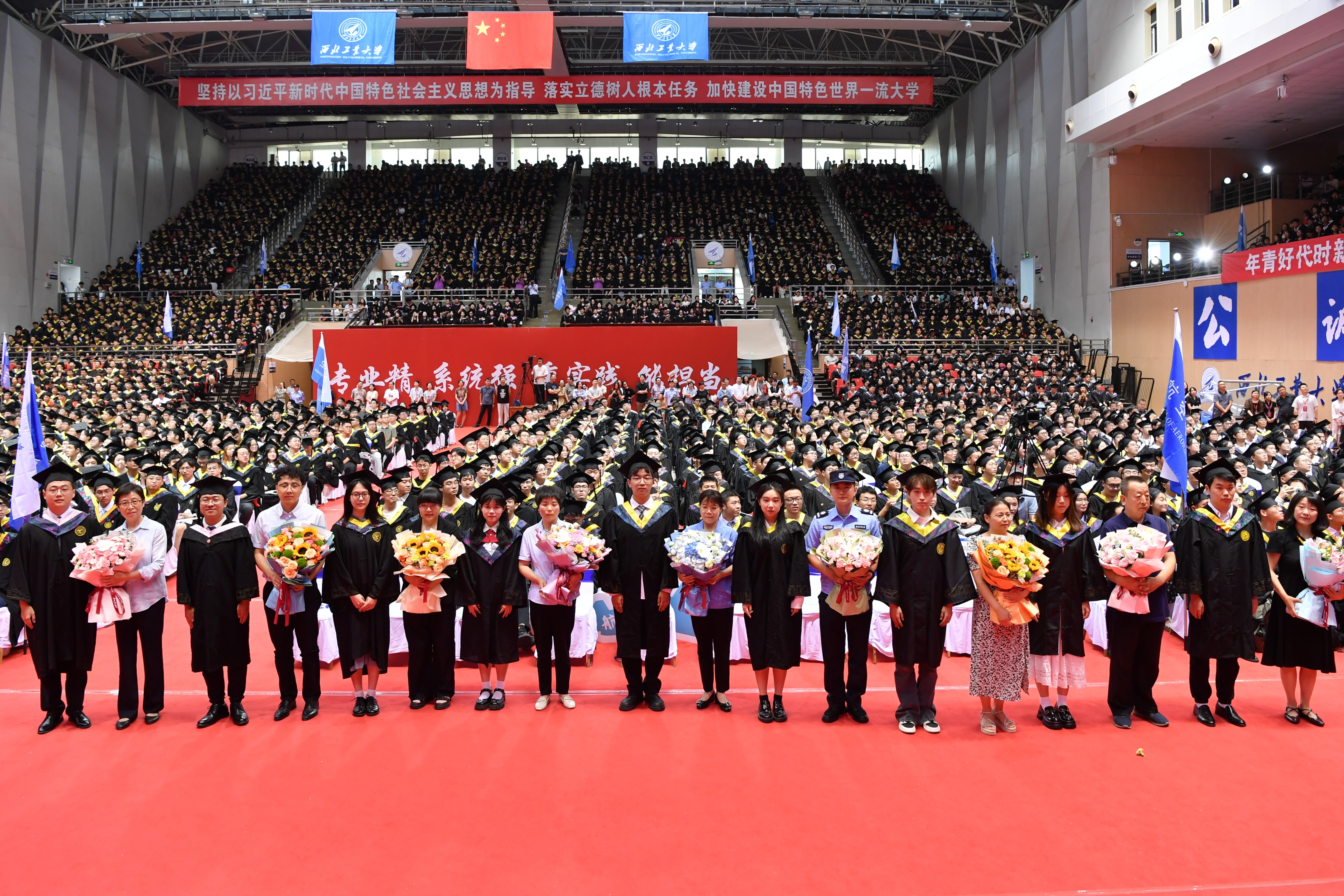 在四年的本科求学旅程中,尽心暖心、贴心知心的师长们,一路陪伴着同学们逐梦奔跑,见证了同学们的点滴成长。典礼现场还特别邀请到了教师代表航空学院赵美英老师、辅导员代表公共政策与管理学院刘锦林老师、班主任代表力学与土木建筑学院林红娇老师、餐厅员工代表冯可利老师、学生公寓管理员代表冀小兰老师、党委保卫部队员代表李旭老师、校医院医生代表王晓燕老师、校车驾驶员代表闫兴伟老师、家长代表材料学院刘苏瑶母亲张英超女士,毕业生代表向他们献上鲜花,感谢师长、家人们的辛勤付出和无私奉献。