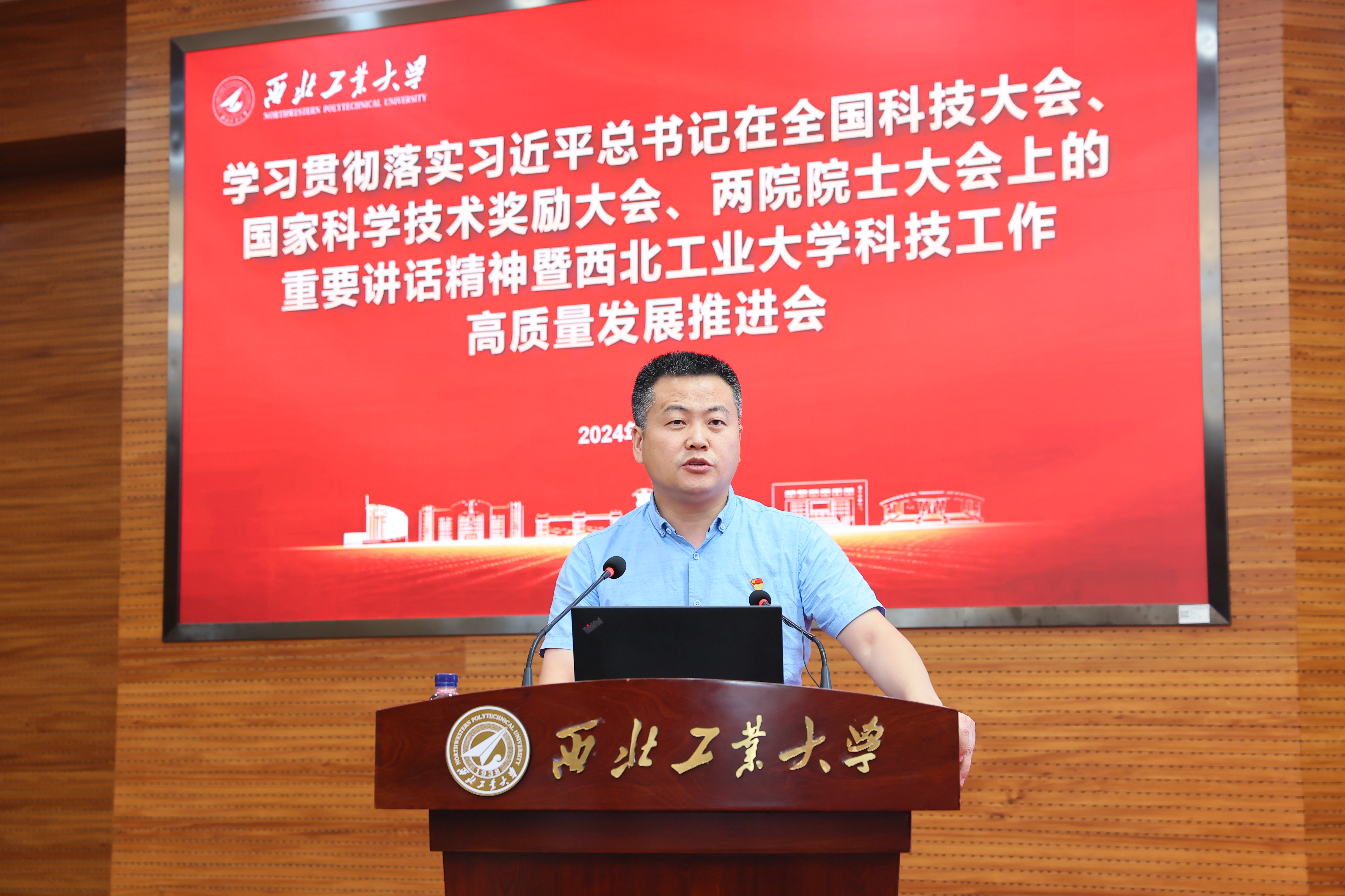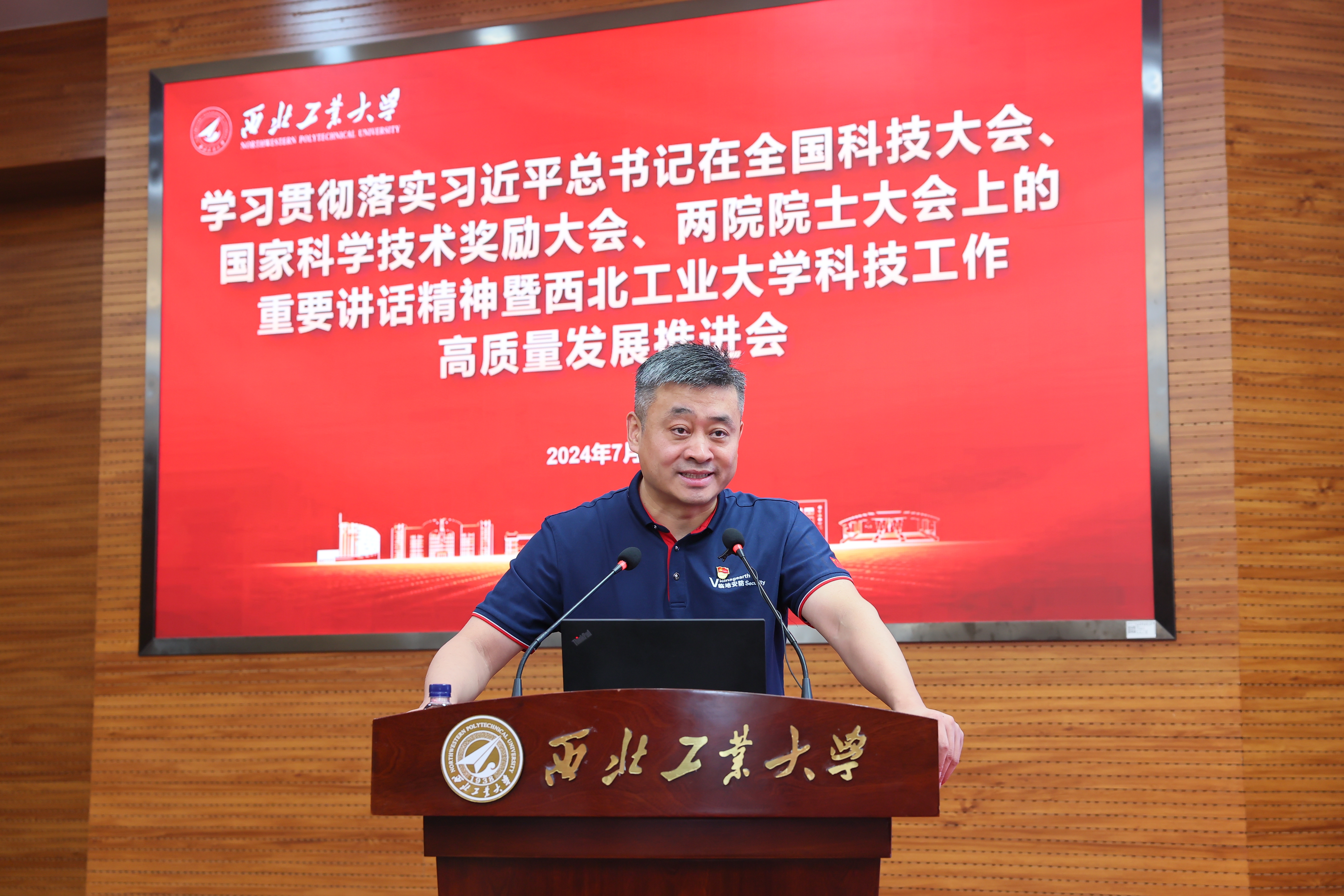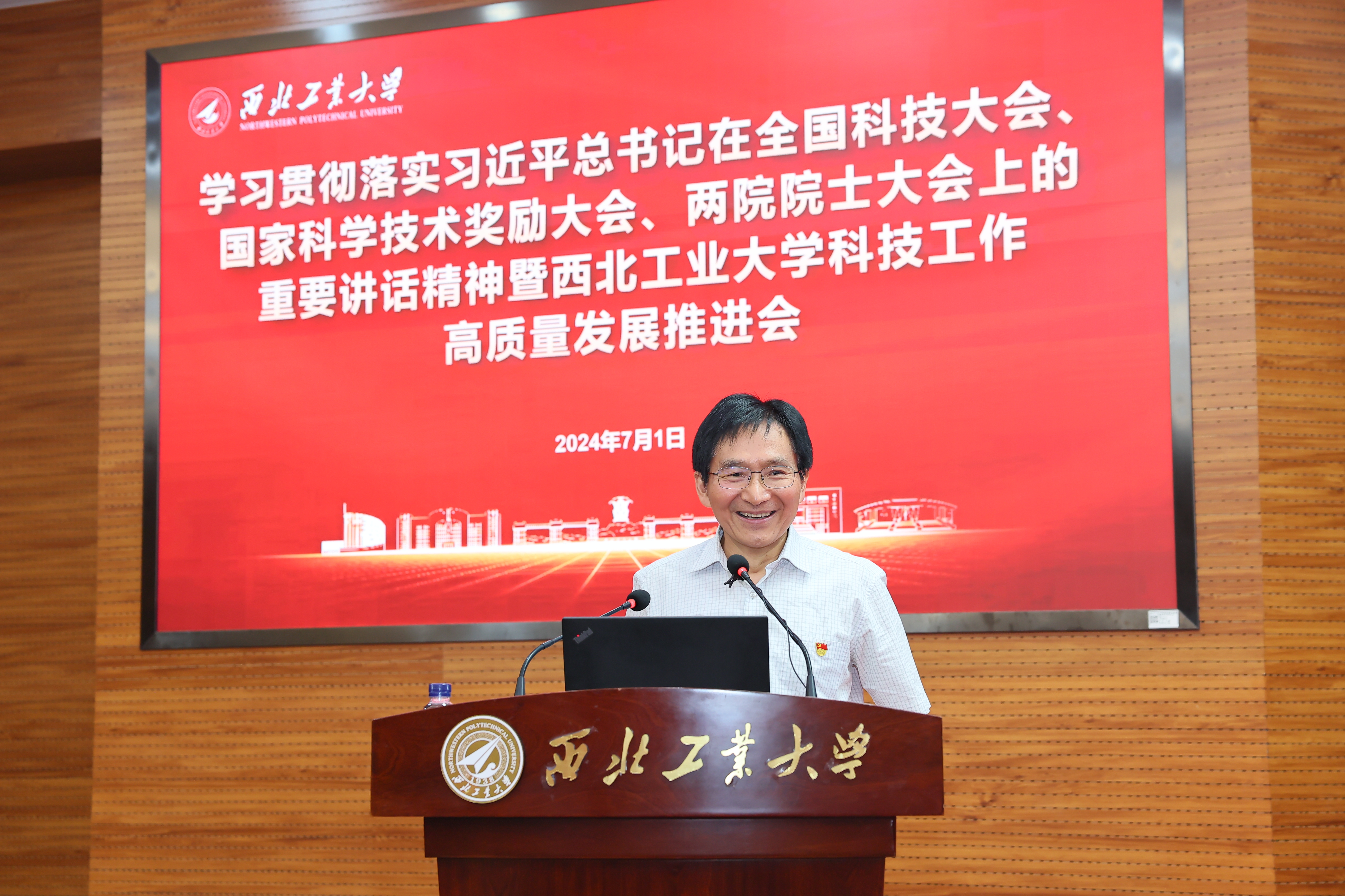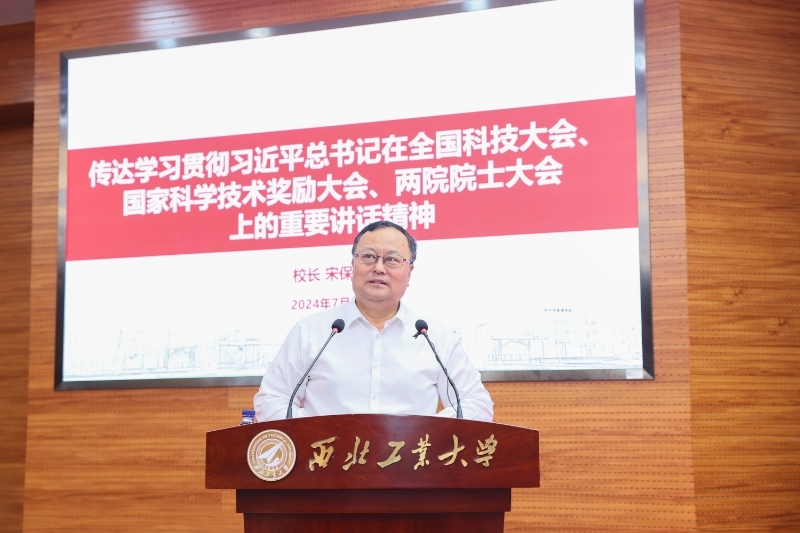宋保维传达了习近平总书记在全国科技大会、国家科学技术奖励大会、两院院士大会上的重要讲话精神并讲授专题党课。他说,本次大会是在以中国式现代化全面推进强国建设、民族复兴伟业关键时期召开的一次具有全局性意义的重要会议。习近平总书记的讲话高瞻远瞩、视野宏阔、思想深邃、内涵丰富,振奋人心、提振士气,让广大科技工作者深受鼓舞、备感激励。学校共8项成果获得国家科学技术奖励,牵头获奖6项,他代表学校党委和李言荣书记,对各获奖团队表示热烈的祝贺,对团结奋进的西工大人表示诚挚的敬意。