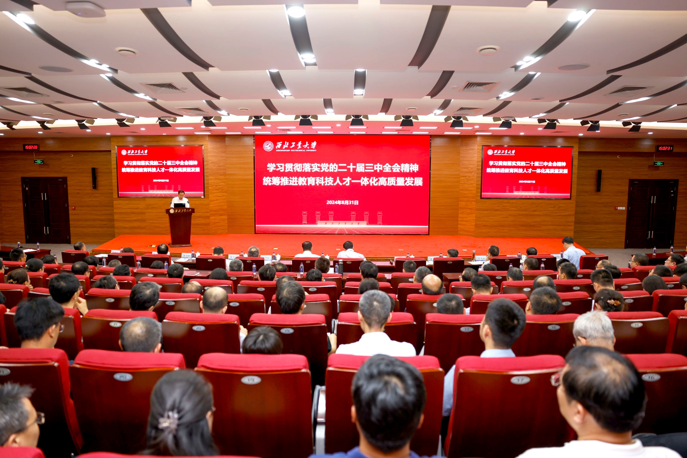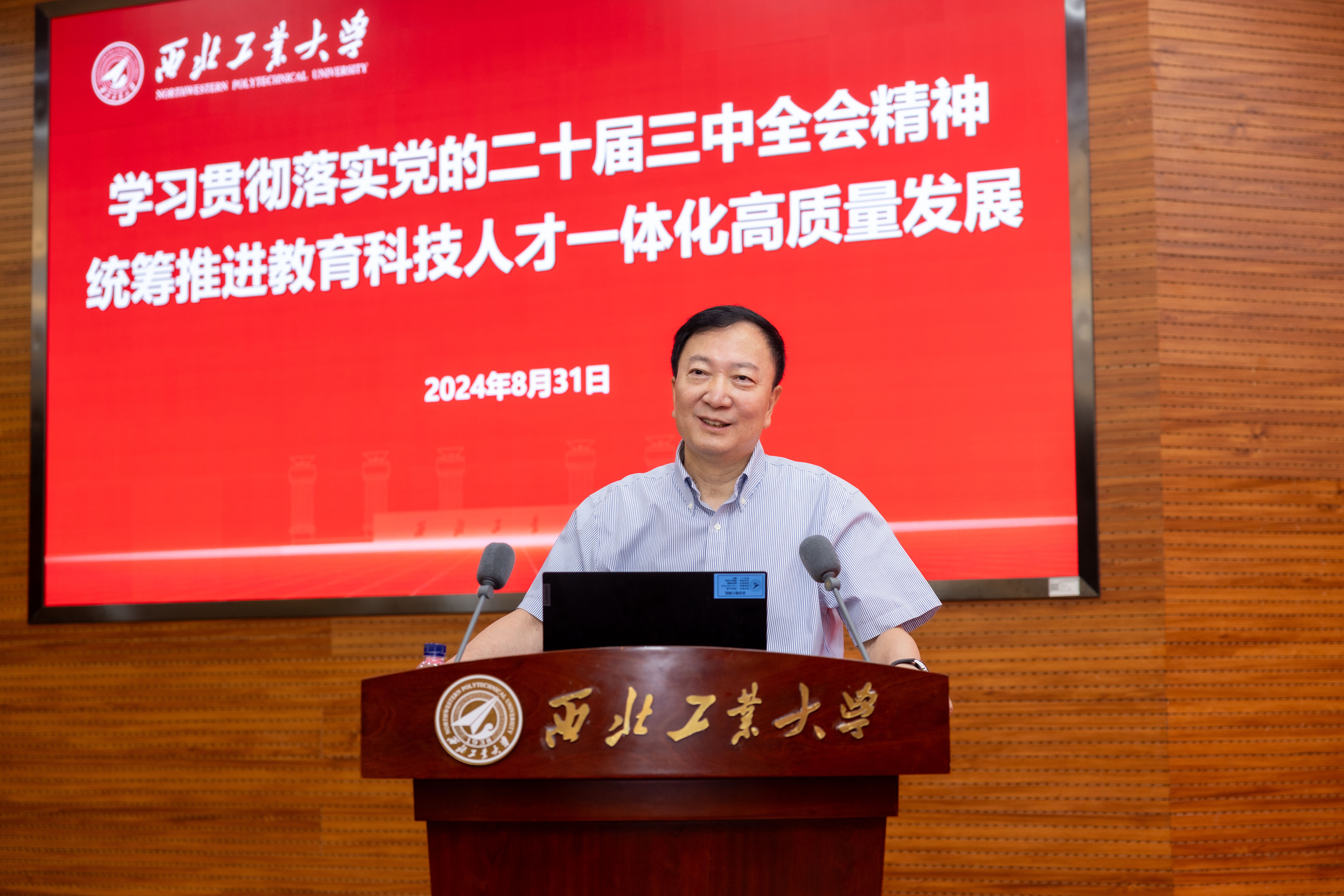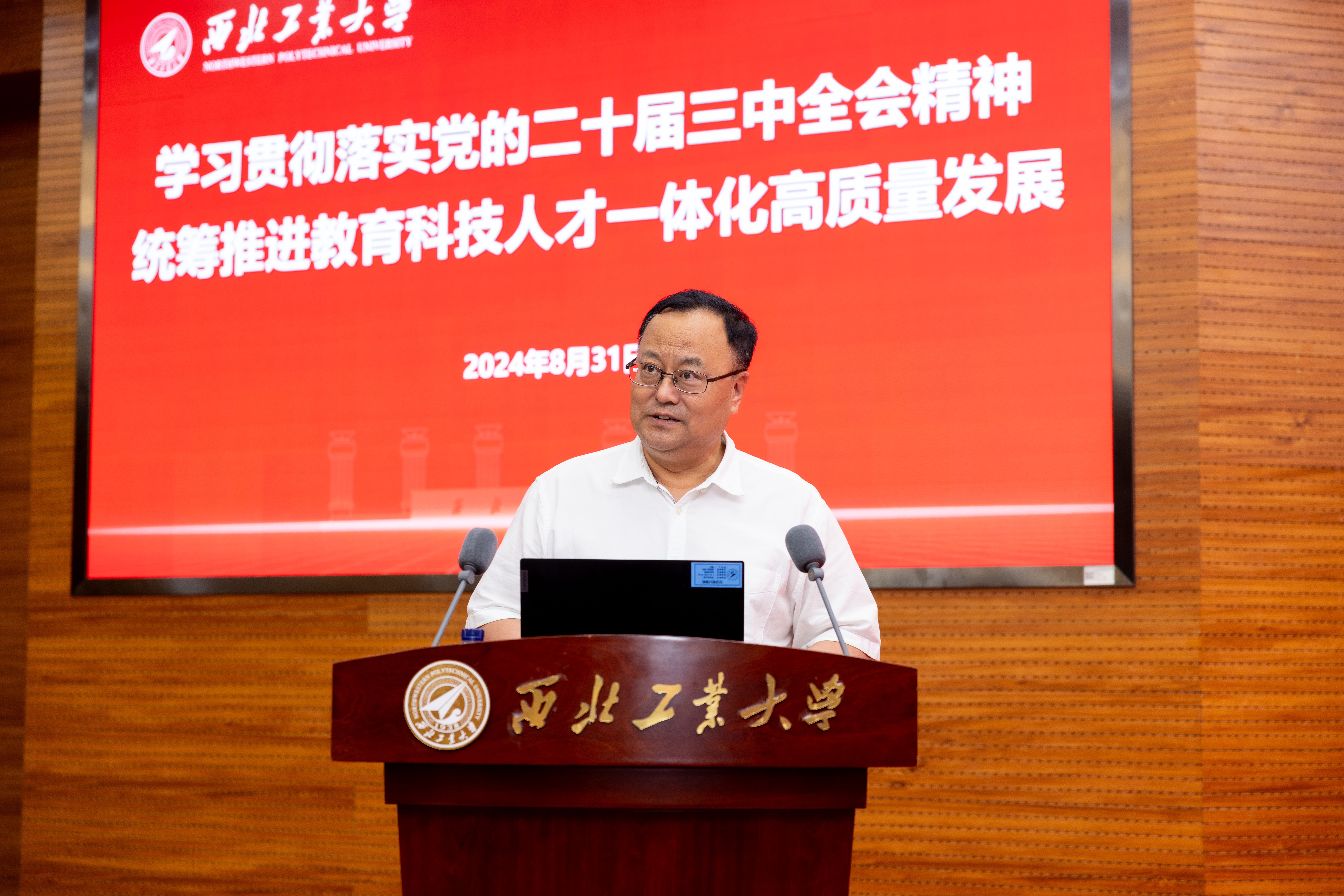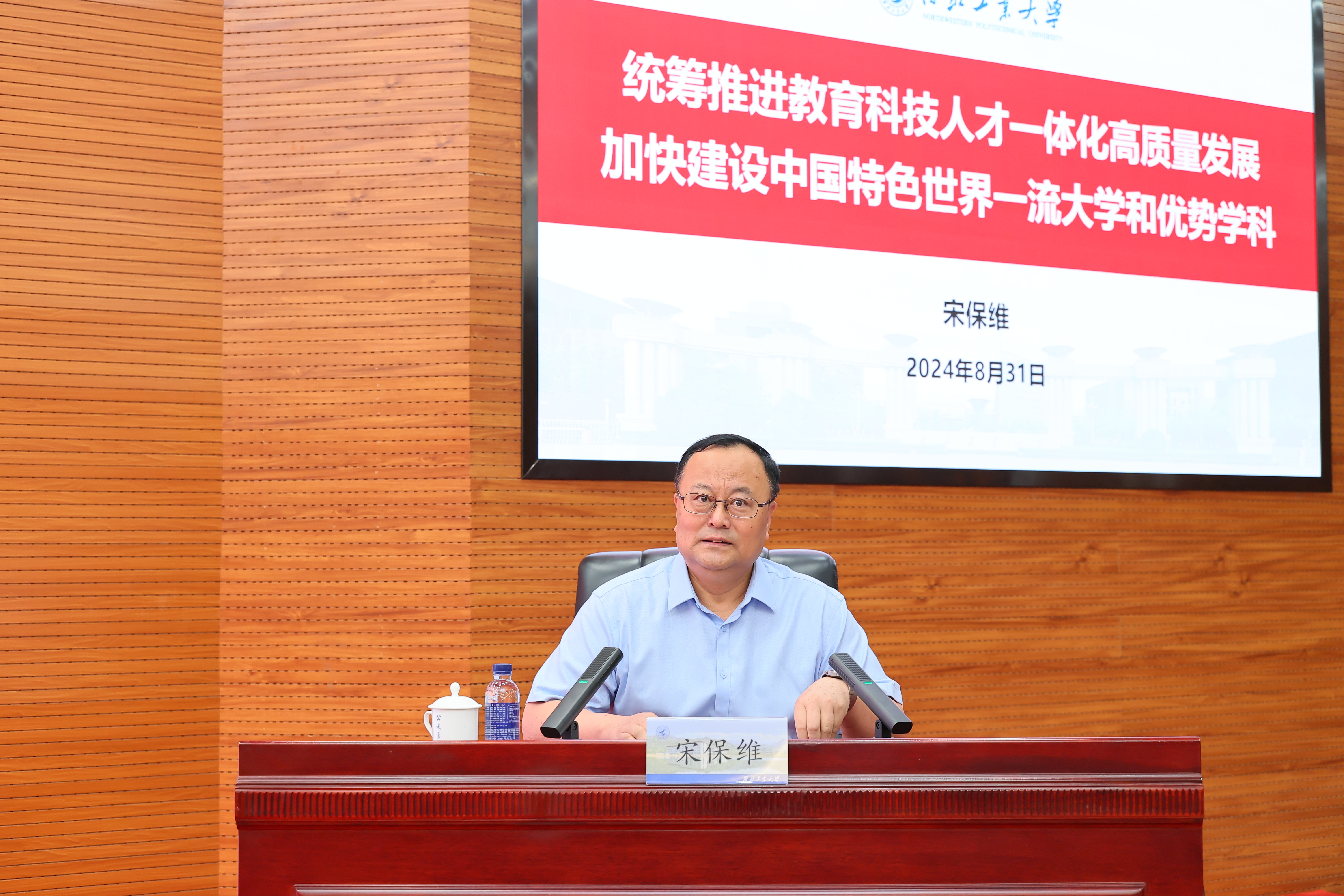 宋保维围绕学习贯彻落实党的二十届三中全会精神,统筹推进教育科技人才一体化高质量发展分享了学习体会和思考,并深入阐述了学校进一步全面深化改革的思路举措。他指出,首先要深入学习领会教育科技人才一体推进的重要意义。一是教育科技人才一体推进是党和国家对高水平研究型大学的新要求。二是教育科技人才一体推进是学校高质量发展的迫切需求。三是教育科技人才一体推进是一流大学和优势学科建设的关键。第二,他从人才培养再创新佳绩、科技创新再获新突破、师资队伍再谱新篇章、国际合作再开新局面、特色学科发展布局逐步构建、学校整体发展态势持续向好等6个方面总结了近年来学校在教育科技人才方面取得的主要成绩。第三,当前学校面临着外部竞争依然激烈、“总师型”人才培养体系有待完善、科研前瞻布局和双向发力有待深化、支撑学校发展的高水平师资队伍有待加强、国际交流合作的力度和成效有待提升等诸多挑战。第四,他强调,新时代新征程,我们既要看到挑战,更要看到机遇。对标党和国家对高水平研究型大学推进教育科技人才一体改革的新要求,我们要在以下5个方面统筹推进:一是要加快完善需求牵引的学科调整机制。要适时“育新苗”,常态化“间苗剪枝”,优化学科布局。要有组织“嫁接发新枝”,拓展学科内涵。要交叉融合“拔尖造峰”,提升学科核心竞争力。二是要不断提高“总师型”人才培养质量。要持续优化招生选拔工作。要持续完善本科专业调整机制。要大力推进育人模式创新,持续提升人才培养质量。要积极打造一流育人资源。三是要持续提升有组织科研的创新能力。要有组织推进“1→0”和“0→1”双向发力,引领支撑目标导向型基础研究创新发展。要强化面向国家战略需求的校企协同攻关,建设高能级科技创新平台。要着力构建交叉融合的创新体系,持续培育新兴科研方向。四是要加快建设支撑学校快速发展的战略人才力量。要强化战略人才梯队建设,为学校发展汇聚势能。要持续完善以创新能力、质量、实效、贡献为导向的人才评价体系。要提升人才服务保障,以多方资源优势汇聚更多优质人才。五是要积极拓展国际交流合作的新范式。要坚决“走出去”,全力办好哈萨克斯坦分校。要坚定“引进来”,强化国际资源引进载体建设。要坚持“送出去”,提升学生全球胜任力。教育科技人才一体改革,不仅需要前瞻性的思考、全局性的谋划、战略性的布局、整体性的推进,还需要有更深层次、更广泛、更高水平的落地见效举措,更需要提高认识抓落实,统筹推进抓落实,提高标准抓落实,营造氛围抓落实。最后,他提出了三点工作要求:一是要提高站位。要深学细悟习近平总书记在党的二十届三中全会上的重要讲话和全会精神,围绕全会精神要有新的思考。二是要解放思想。围绕所在单位分管领域,在改革创新上要有新的举措。三是要强化担当。在分管工作方面,在谋划发展上要有新的做法。
